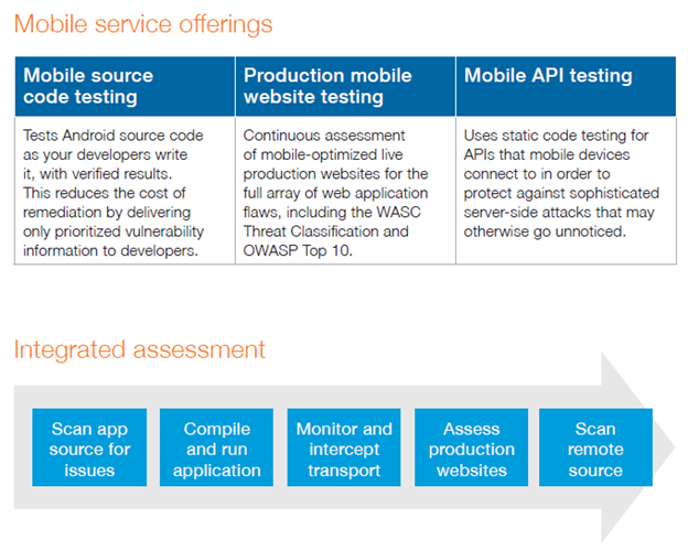 Unlike traditional mobile application testing, WhiteHat Security takes a holistic approach to testing by embracing the complexity of the application architecture. WhiteHat provides offerings that are easily integrated across the mobile security spectrum to meet the requirements of your specific business needs, at the client, network, and server layers.